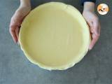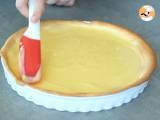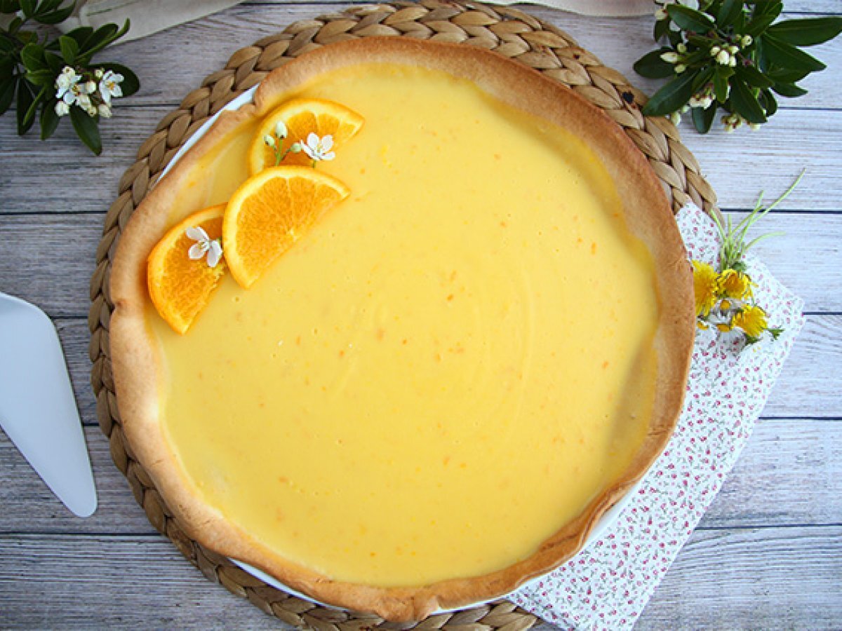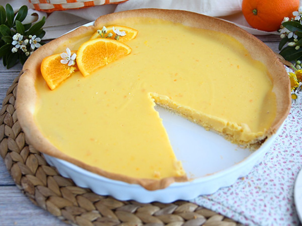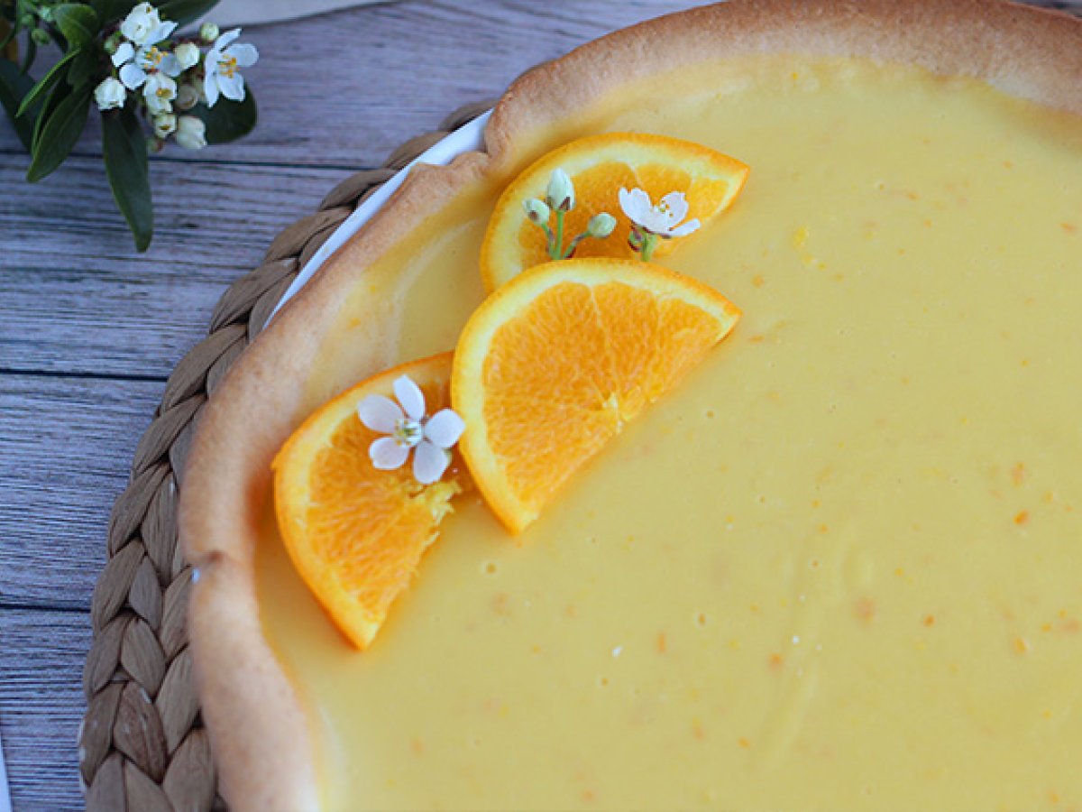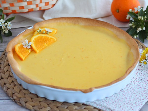 Den Mürbeteig in einer Kuchenform ausrollen. Den Teig mit einer Gabel einstechen und für 20 Minuten bei 180°C in den Ofen geben. Drücken Sie die Orangen aus und entfernen Sie die Schale einer Orange.