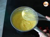In einem Topf Eier, Zucker und Maisstärke vermischen. Den Saft und die Schale einer Orange hinzufügen. Bei mittlerer Hitze unter Rühren mit einem Schneebesen eindicken.