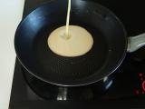 Eine Crêpepfanne erhitzen und mit einem in Öl oder Butterschmalz getränkten Küchenpapier die Pfanne einfetten. Eine halbe Kelle Teig hineingeben.