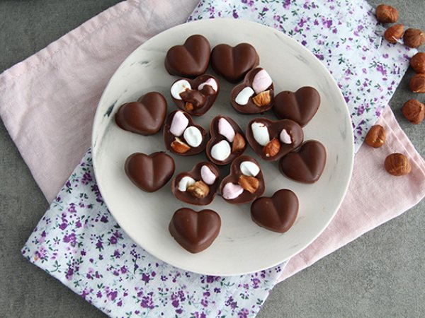 Gießen Sie etwa 1 Teelöffel geschmolzene Milchschokolade in eine Form, fügen Sie die Marshmallow-Enden und dann die Haselnussstücke hinzu. 1 Stunde kalt stellen.