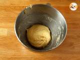 Mit einem Teigtrichter eine Kugel formen. Decken Sie die Schüssel mit einem Geschirrtuch ab und lassen Sie den Teig 1 Stunde und 30 Minuten bei Zimmertemperatur ruhen. Anschließend den Teig abdecken und 1 Stunde kalt stellen.