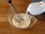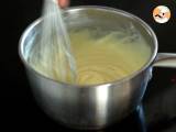 Die Milch mit der anderen Hälfte des Zuckers und der Vanille aufkochen. Die Hälfte der Milch direkt in die Schüssel geben und gut verrühren. Dann gießen Sie diese Mischung in den Topf. Mischen und dann wieder auf den Herd stellen.