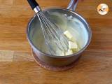 Nehmen Sie die Pfanne vom Herd und geben Sie die in kleine Stücke geschnittene Butter hinein. Gut mischen. Folie „in Kontakt“: Legen Sie die Frischhaltefolie über die gesamte Oberfläche der Creme, um ein Austrocknen zu verhindern. Kühl stellen und vollständig abkühlen lassen.