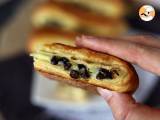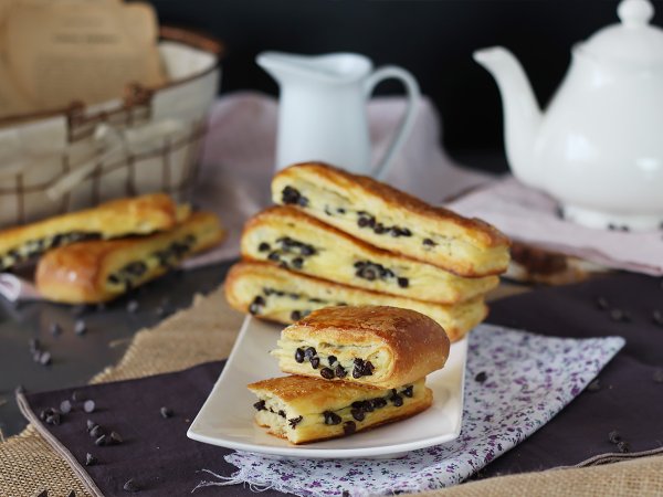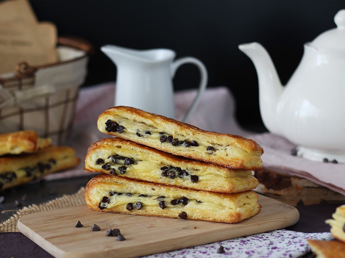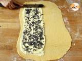 Die Konditorcreme auf der Hälfte der Oberfläche verteilen. Geben Sie die Schokoladenstückchen auf die gesamte Oberfläche der Creme und drücken Sie sie mit einem Spatel oder Löffel in die Creme.