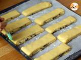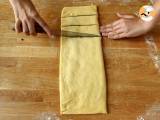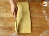 Nehmen Sie den Brioche-Teig aus dem Kühlschrank und lüftenSie ihn. Arbeitsfläche und Teig gut bemehlen, dann den Teig zu einem Rechteck (ca. 4-5 mm dick) ausrollen.