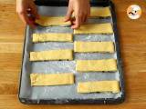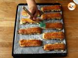Den ungefüllten Teil über die Konditorcreme klappen. Schneiden Sie die Kanten ab, sodass ein sauberes Rechteck entsteht.