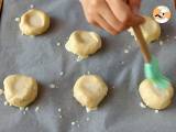 Die Kugeln auf ein mit Backpapier ausgelegtes Backblech legen. Die Kugeln flach drücken und dann mit der restlichen Mischung aus Milch + Ei bestreichen. Mit Zucker bestreuen.