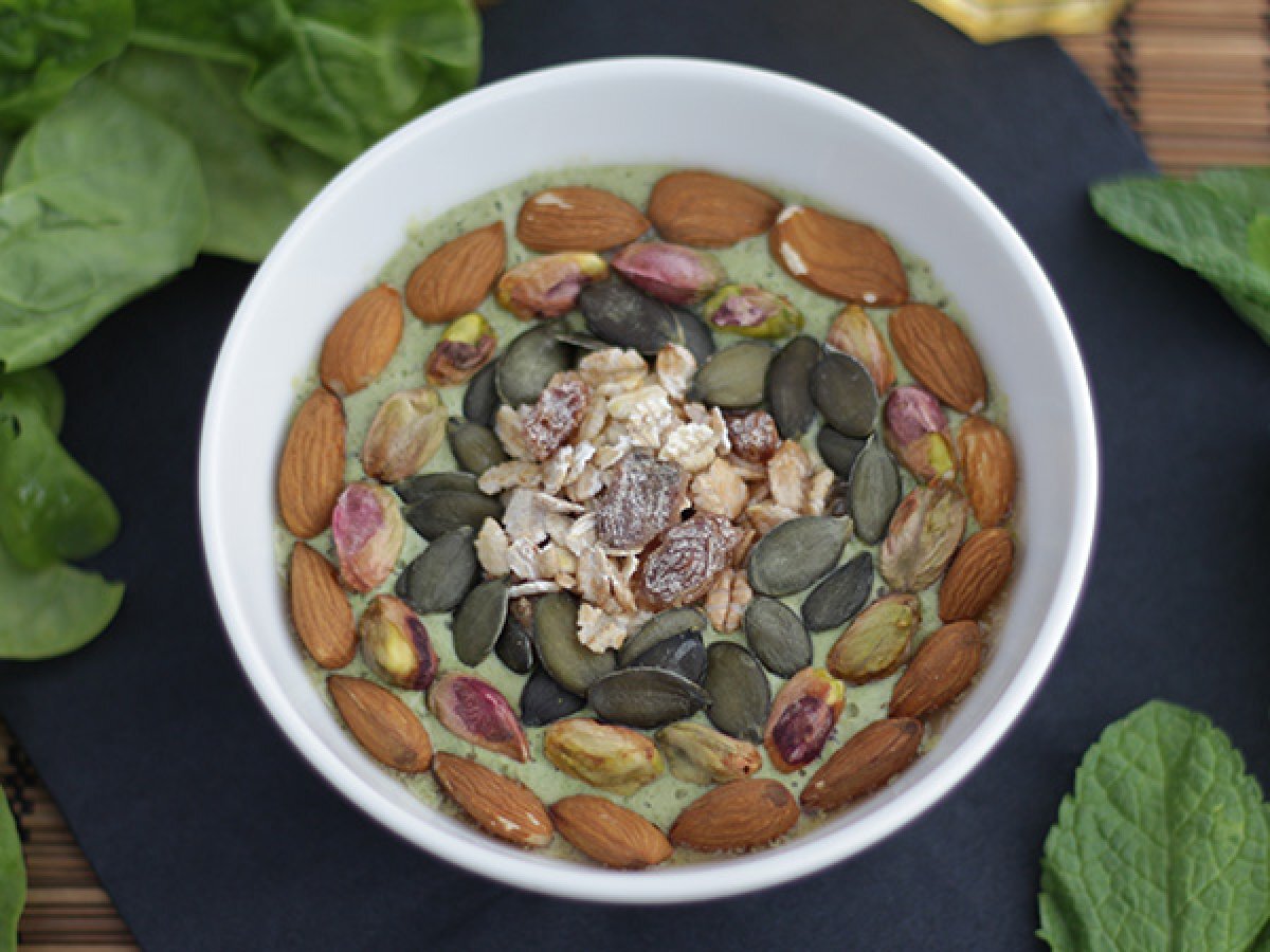 Wir gehen davon aus, dass Sie alle Smoothies kennen! Aber sagt Ihnen die Smoothie Bowl etwas?! Nun, es ist ganz einfach das gleiche Prinzip, nur etwas gehaltvoller, und das Ganze wird in eine Schüssel gegossen. Ob zum Frühstück, als Snack oder zum Dessert, wir freuen uns auf diese Vitamin- und Energiebombe! Was die Zutaten angeht, die Sie hinzufügen möchten, haben Sie die freie Wahl! Wir haben uns für eine Version mit Spinat entschieden, um Ihnen zu zeigen, dass Sie auch andere Zutaten als Obst verarbeiten können! In Kombination mit der Frische der Minze und der Süße der Kiwi werden Sie sehen, dass diese drei Zutaten perfekt zusammenpassen ;-) Für die Cremigkeit haben wir einen griechischen Joghurt hinzugefügt. Sie können ihn auch durch Milch ersetzen. Wenn Sie laktoseintolerant sind, keine Panik, Sie können Ihre Speisen mit einem guten Sojajoghurt oder pflanzlicher Milch (Mandeln, Haselnüsse, Kokosnuss, etc.) mischen.