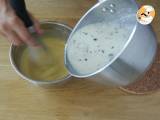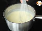 Wenn die Milch kocht, fügen Sie sie nach und nach zur vorherigen Mischung hinzu und geben Sie dann alles wieder in den Topf.