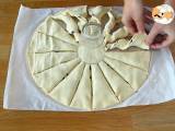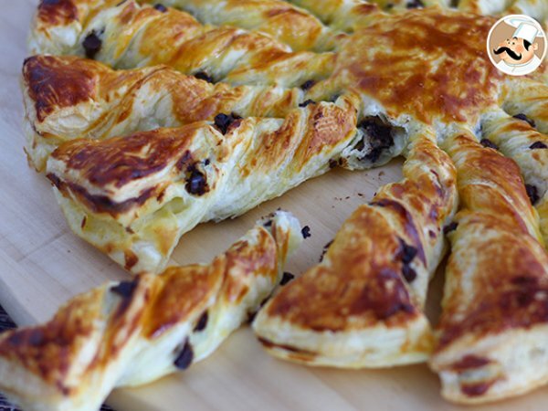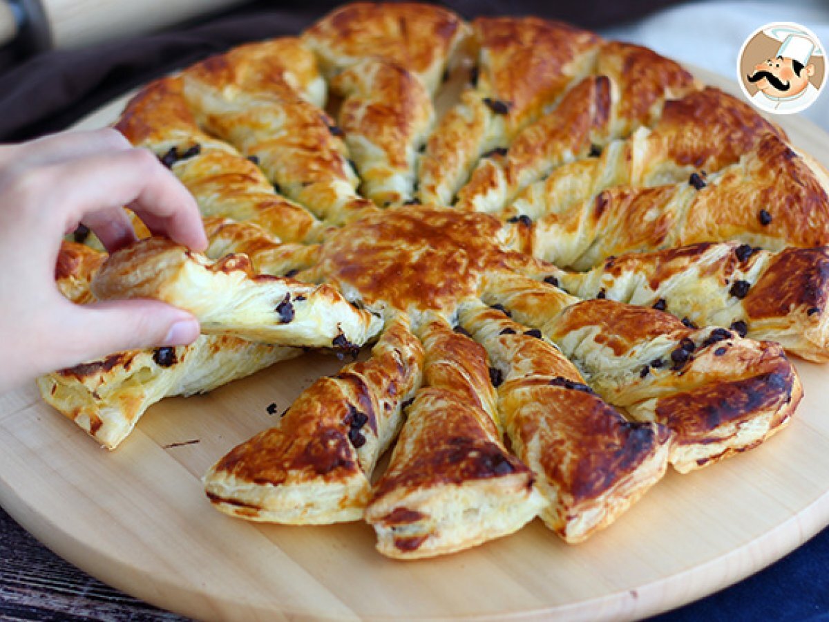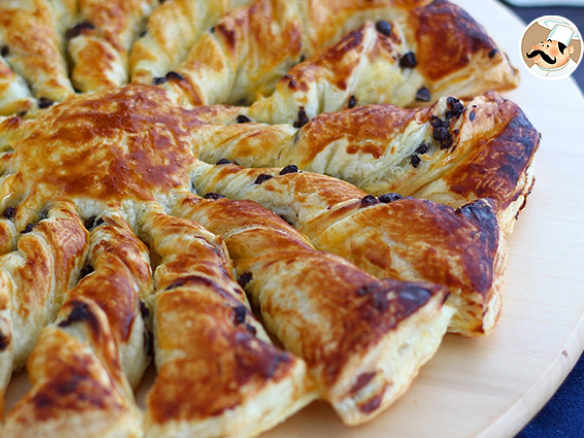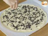 Einen Blätterteig ausrollen und die kalte Teigcreme darauf verteilen. Anschließend mit Schokoladenstückchen bestreuen. Alles mit dem zweiten Blätterteig bedecken.