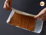 Spekulatius auf der halben Fläche des rechteckigen Blätterteigs verteilen. Den Teig halbieren.