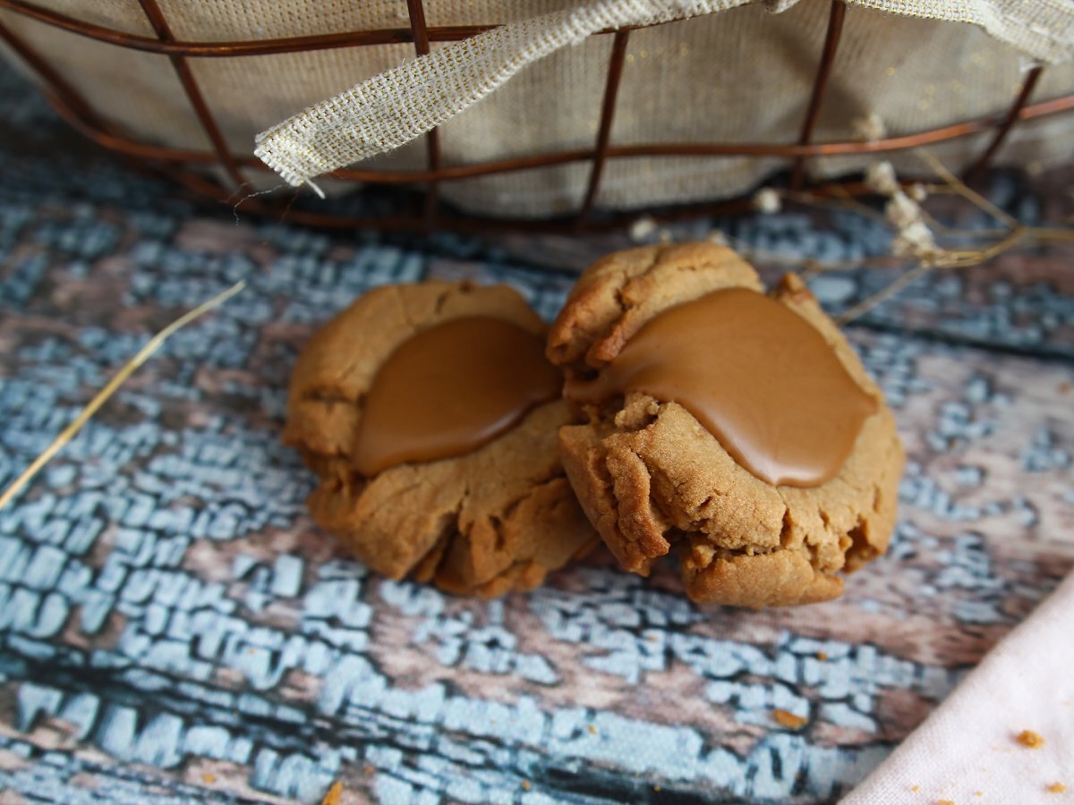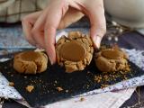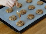 Zerdrücke die Kugeln mit einem Teelöffel. Die Kekse für 10 Min. bei 170°C in den Ofen geben.