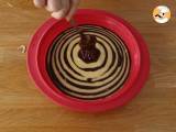 Um sicherzustellen, dass Ihr Zebrakuchen perfekt marmoriert ist, verwenden Sie einen Esslöffel, um abwechselnd die Kakaomischung und die Vanillemischung in die Mitte der Form zu geben. Lassen Sie die Mischung beim Backen nicht vermischen, um das schöne Muster zu erhalten.