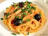 Zutaten: 360 g Spaghetti 750 ml Rotwein 8 Teelöffel Tomatenmark 40 g geriebener Parmesankäse (oder Grana Padano) Schwarze Oliven zum Abschmecken (etwa 4/5...