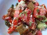 Zutaten: 2 Tomaten 1/2 Gurke 1/2 grüne Paprikaschote 1 rote Zwiebel 50 g entkernte schwarze Oliven 100 g Feta Olivenöl Oregano Salz