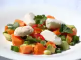 Zutaten: Der Salat: 300 g Hähnchen (1 Filet) 1 Karotte 1/2 Apfel 30 g grüne Oliven 80 g Erbsen 80 g Mais 15 g Petersilie Die Soße: 150 g Weißkäse 2 EL...
