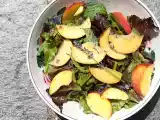 Zutaten: etwas Eiskraut Salat etwas Eichblatt Salat 1 Pfirsich frischer Lavendel eine Zitrone ein Teelöffel Honig Salz und Pfeffer