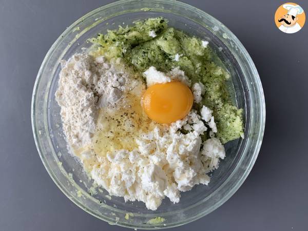 Die geriebenen und abgetropften Zucchini in eine Schüssel geben und Salz, Pfeffer, Ei, Mehl und den zerbröckelten Feta hinzufügen.