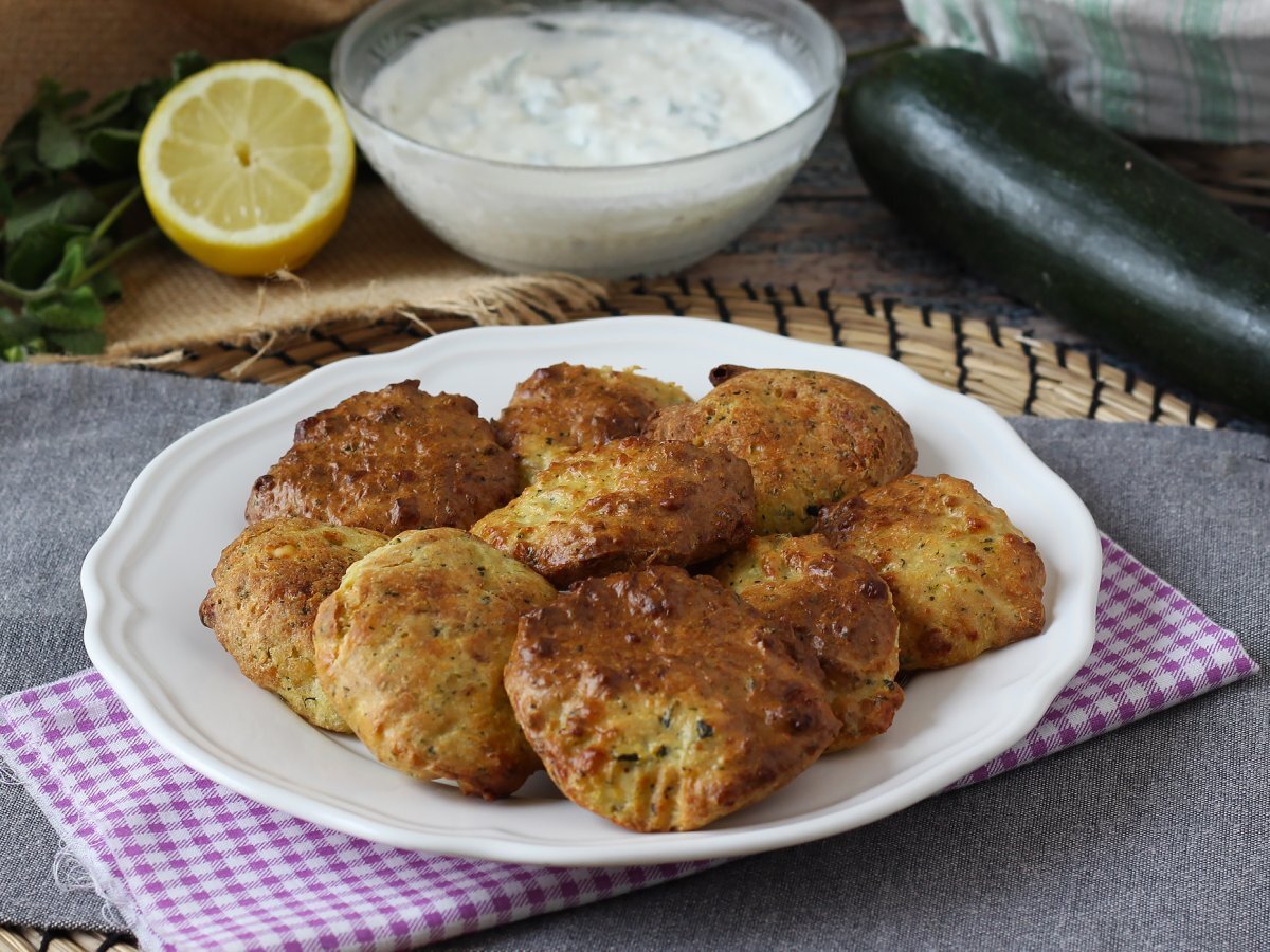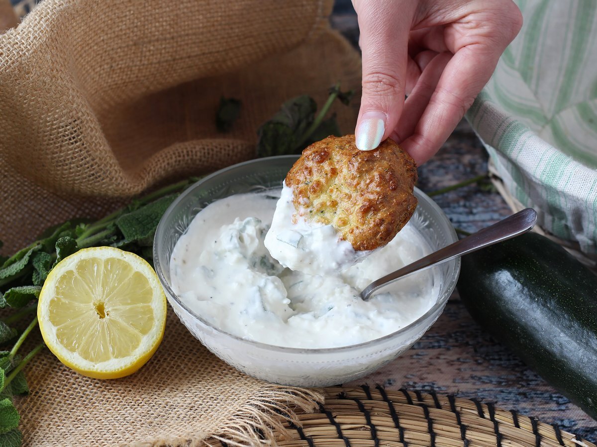 Air fryer zucchini beignets mit joghurt-feta-sauce