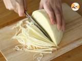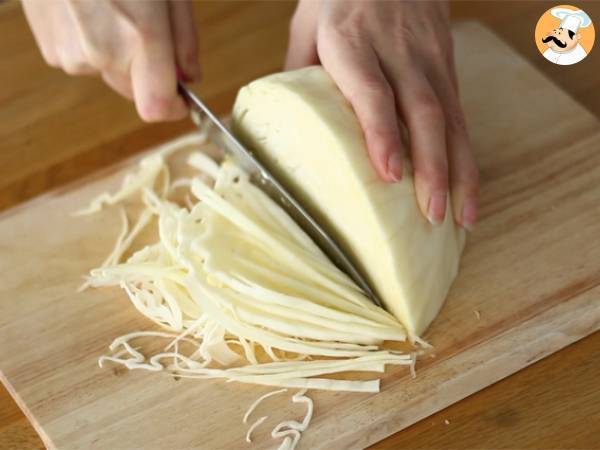 Den Viertelkohl in dünne Streifen schneiden.