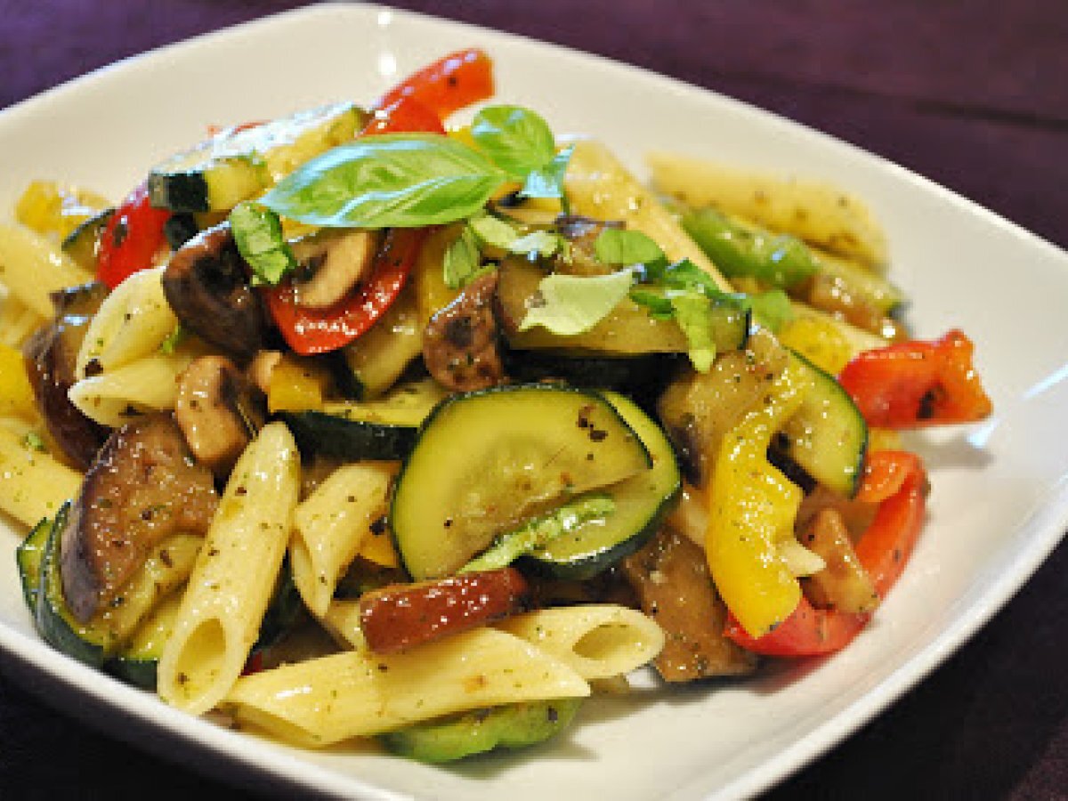 - Dann die abgekühlten Gemüse, gehackten Basilikum und die abgekühlten Nudeln gemischt. Teilmengen von Balsamico-Creme und Würze, wieder probieren.