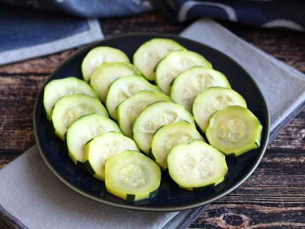 - Verbreiten Sie Auberginen und Zucchini nebeneinander auf der Platte und 15 min.