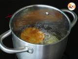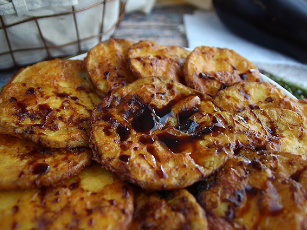 Die Auberginen in kochendem Öl von jeder Seite etwa 2 Minuten braten und auf Küchenpapier legen.