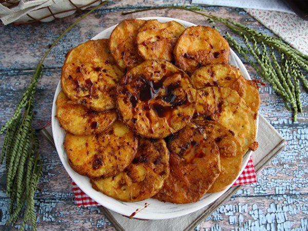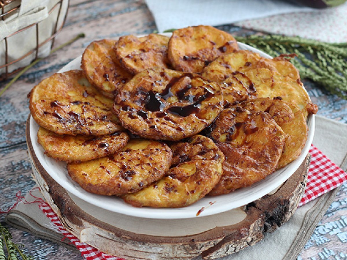Eine Aubergine schälen und in Scheiben schneiden. Die Scheiben mit Mehl bedecken und dann in die Mischung tauchen.