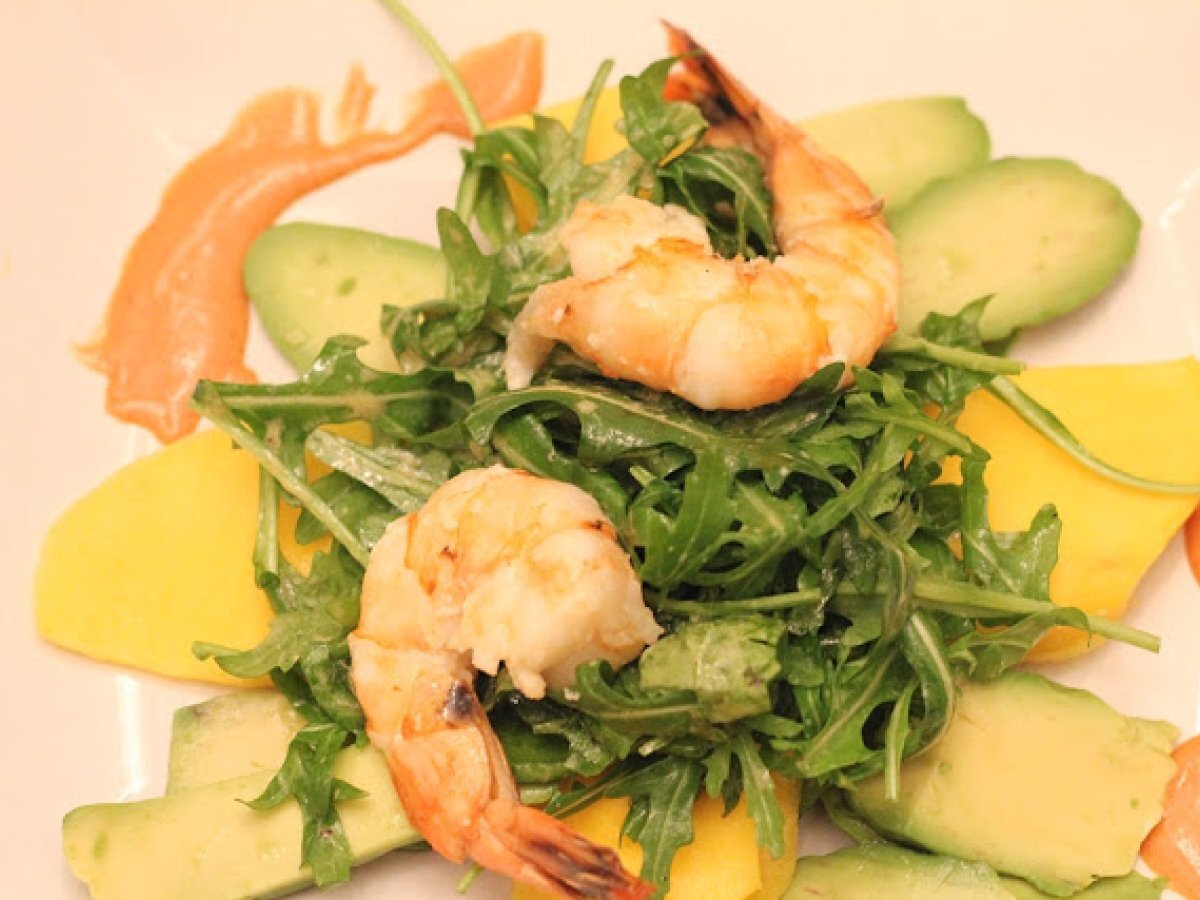 Black tiger garnelen mit avocado-mango-carpaccio und rucola