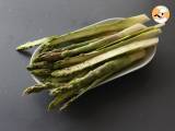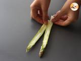 Waschen Sie den Spargel und bereiten Sie ihn vor, indem Sie bei Bedarf den harten Teil schneiden oder reiben. Den Spargel halbieren, wenn er groß ist.