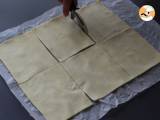 Den Blätterteig in 6 Rechtecke schneiden. Die Schinkenscheiben halbieren. .