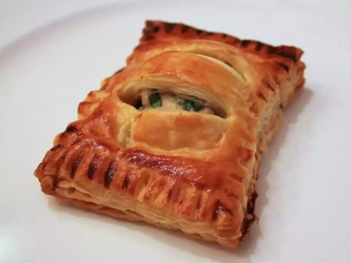 - Schneiden Sie den Blätterteig in Stücke von 6 cm x 5 cm. Die Hälfte der geschnittenen Stücke dreimal (zur optischen Oberfläche).