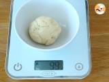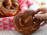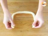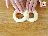 Führe die beiden Ränder in der Mitte zusammen, kreuze sie zweimal und klebe sie an die Basis der Brezel indem du sie drückst.