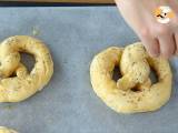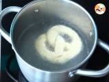 Wasser mit Salz und Backpulver zum Kochen bringen. Tauchen Sie die Brezeln eins nach dem anderen und lassen Sie sie für maximal 30 Sekunden.