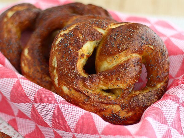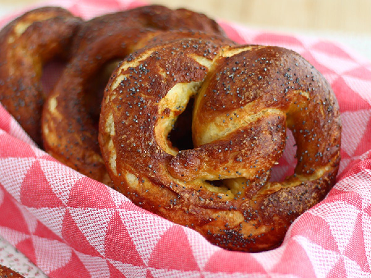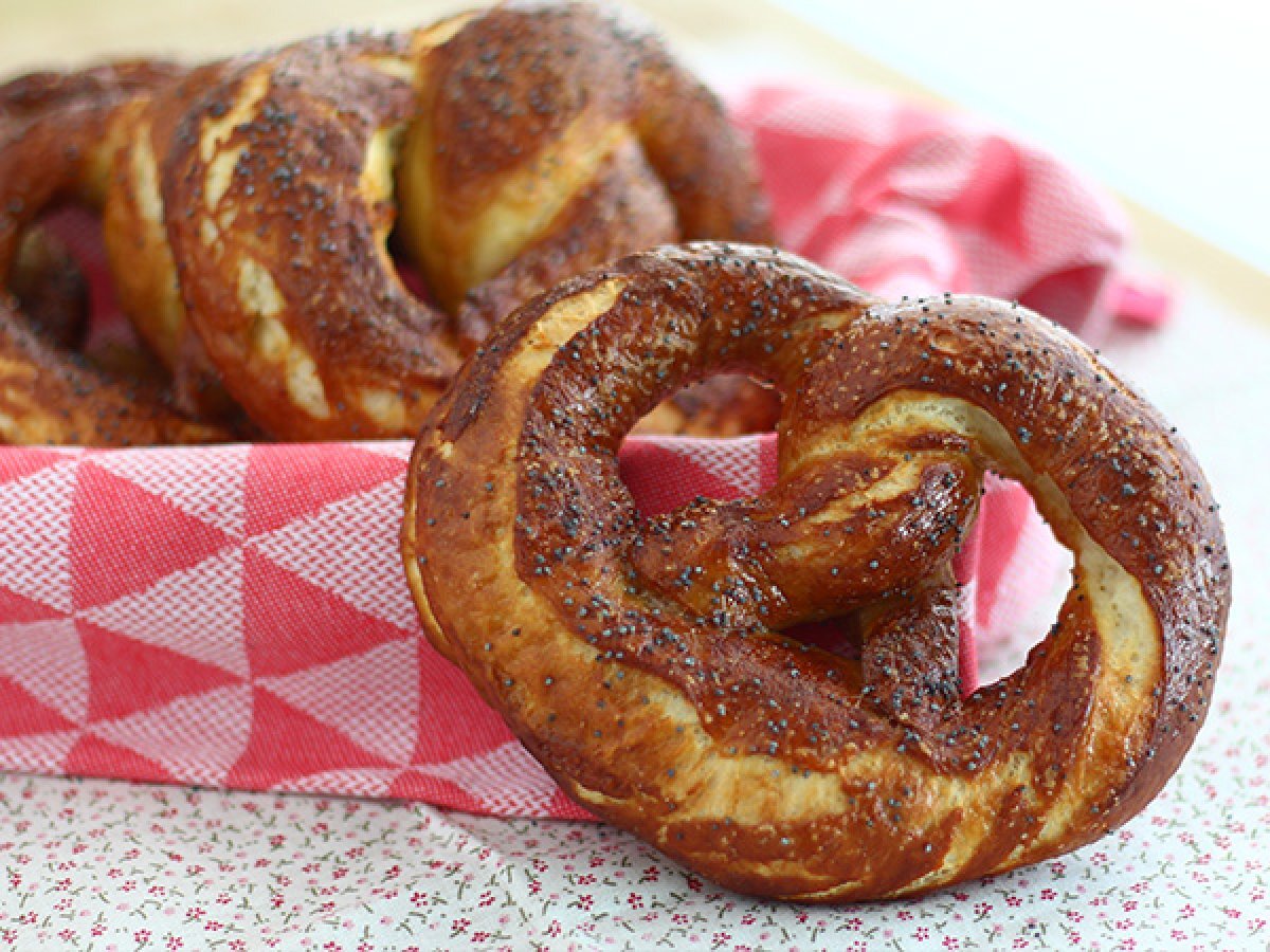 Die aus dem Wasserbad entnommenen Brezeln direkt auf den Backblech geben. Auf jede Brezel das geschlagene Ei auftragen und mit Salz und Mohn bestreuen.