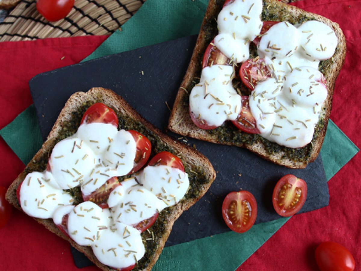 Bruschetta mit pesto, kirschtomaten und mozzarella-käse