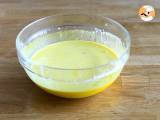 In einer Schüssel das Ei mit einem Schneebesen leicht schlagen, gerade genug, um die Struktur aufzubrechen. Dann das Mineralwasser + Mehl + Backpulver + Farbstoff + Cognac hinzufügen. Gut schlagen, bis ein feiner Teig ohne Klumpen entsteht.