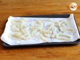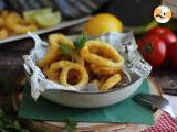 Nach dieser Zeit den Tintenfisch gut putzen und in Ringe schneiden. Legen Sie die Ringe auf saugfähiges Papier, um überschüssige Feuchtigkeit zu entfernen (dies verbessert das Braten).
