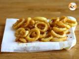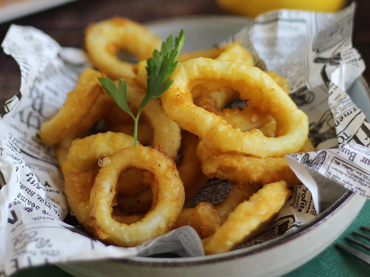 5 Minuten braten oder bis die Ringe eine goldene Farbe annehmen. Wenn Sie sie aus der Fritteuse nehmen, legen Sie sie auf ein Tablett mit saugfähigem Papier, um überschüssiges Öl zu entfernen. Salz nach Geschmack