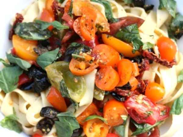 - Dann mischen Sie in einer Schüssel mit Oliven, getrockneten Tomaten, Kräutern und Olivenöl.