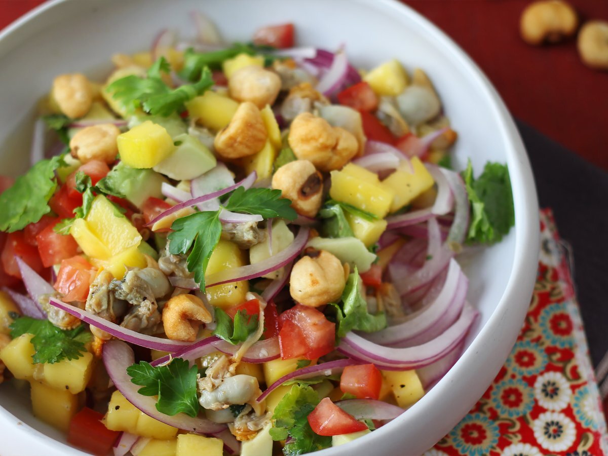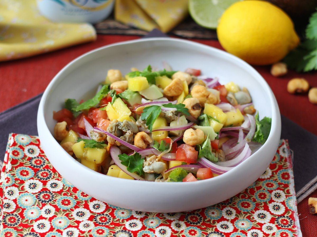 Ceviche ist ein traditionelles peruanisches Gericht, bei dem roher Fisch, der in Limetten- oder Zitronensaft mariniert wird, die Hauptrolle spielt. Wir von Petitchef haben eine schnelle Version aus einer Dose Herzmuscheln zubereitet, mit einem wirklich überraschenden Ergebnis. Eine Geschmacks- und Farbexplosion, die das Beste aus dem Meer mit den süßen Noten von Mango und Avocado kombiniert. Perfekt als leichte Vorspeise oder um Ihre Gäste bei einem besonderen Essen zu überraschen, ohne viel Aufwand.