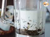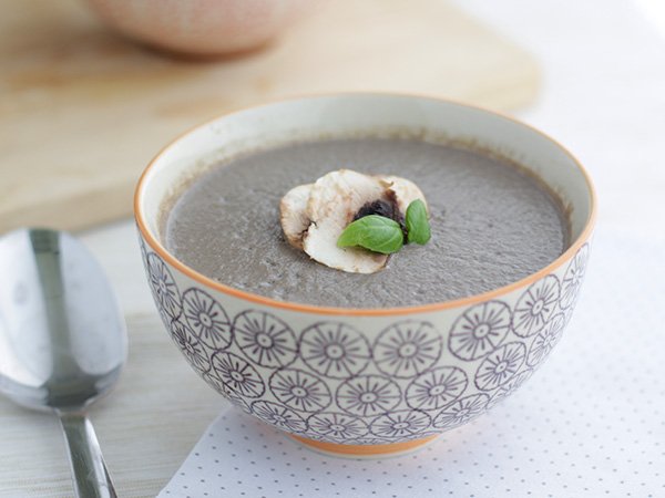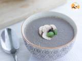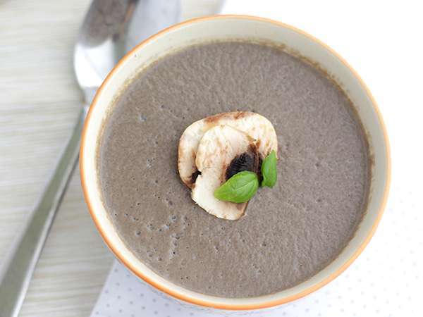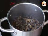 In einem Mixer die Pilze und ihr Kochwasser sowie die erhitzte flüssige Sahne vermischen. Gut Mixen, bis die Mischung homogen ist.