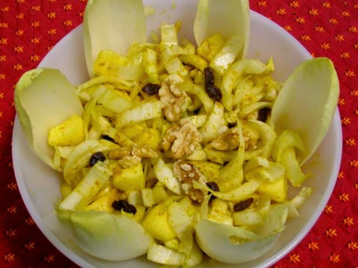 Äpfel schälen, halbieren, das Kerngehäuse herausschneiden und in kleine Würfel schneiden. - Chicorée, Äpfel, Rosinen und Walnüsse dazugeben und vorsichtig umrühren.