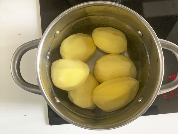 Die Kartoffeln schälen und mit reichlich Wasser und Salz in einen Topf geben. Kochen Sie sie, bis sie weich sind. Die Dauer hängt von der Größe der Kartoffeln ab, beträgt aber normalerweise 20-25 Minuten. Um zu prüfen, ob sie fertig sind, stechen Sie mit einer Messerspitze in eine Kartoffel: Wenn sie sich leicht ein- und ausstechen lässt, ist sie perfekt gekocht.