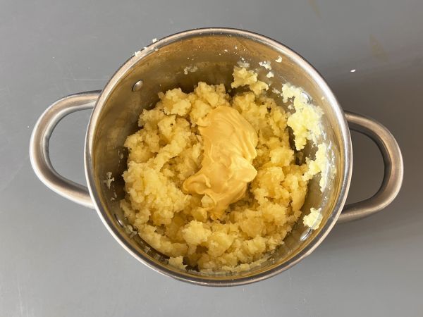 Nach dem Garen abtropfen lassen und mit einer Gabel oder einem Kartoffelstampfer zerdrücken. Mit Salz und Pfeffer abschmecken und mit zwei bis drei Esslöffeln Mayonnaise vermischen, bis eine glatte, aber feste Paste entsteht.