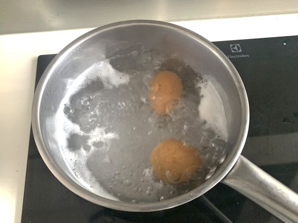 Während die Kartoffeln kochen, die Eier etwa 10 Minuten in Wasser kochen. Danach unter kaltem Wasser abschrecken und pellen.
