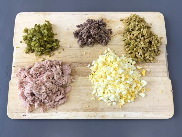 Oliven, Sardellen, gekochte Eier (die Hälfte des Eigelbs zur Dekoration aufbewahren) und Gewürzgurken hacken und alles in einer Schüssel mit dem gut abgetropften Thunfisch vermischen.