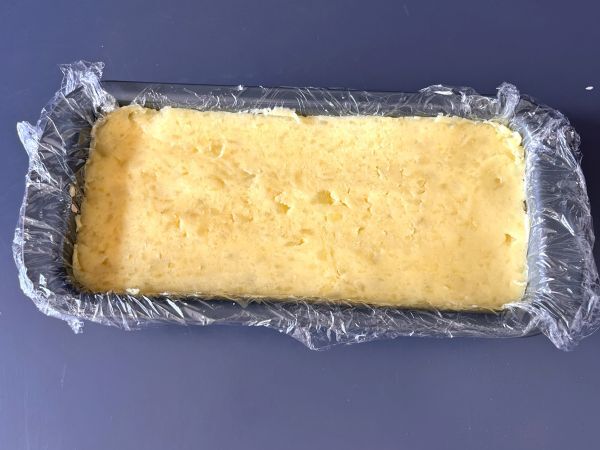 Eine rechteckige Backform mit Frischhaltefolie auslegen, dabei an den Rändern etwas überstehen lassen, damit sich die Form leicht lösen lässt. Eine Schicht Kartoffelpüree auf dem Boden verteilen und gut glattstreichen.
