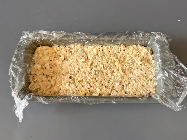 Eine Schicht der Thunfisch-Ei-Gurken-Mischung darauf geben. Den Vorgang abwechselnd wiederholen und mit einer letzten Schicht Kartoffeln abschließen. Mit der restlichen Frischhaltefolie abdecken und für mindestens 1 Stunde in den Kühlschrank stellen, damit die Thunfisch-Ei-Gurken-Mischung fest wird und sich die Aromen entfalten können.