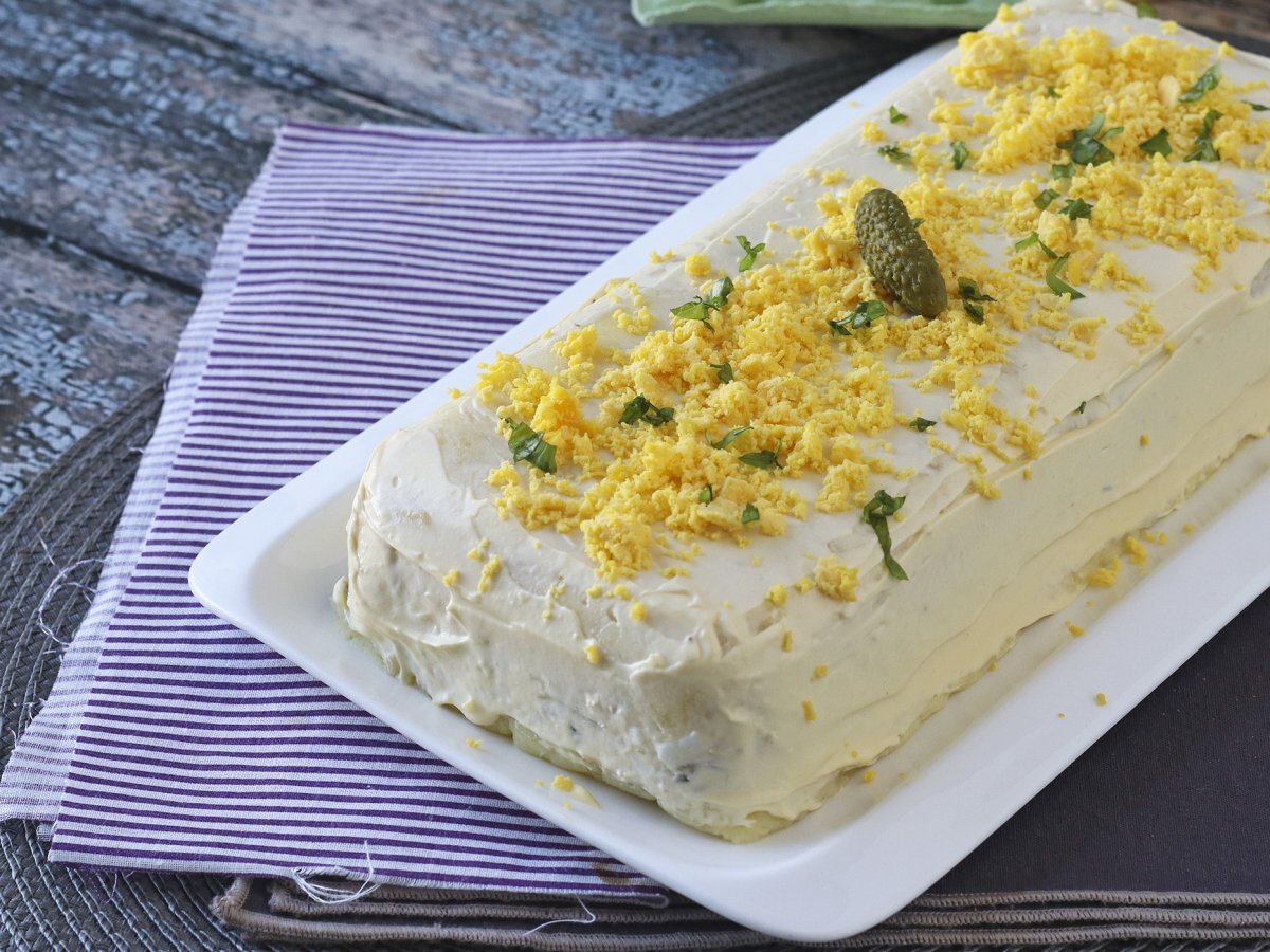 Nach der Ruhezeit den Kuchen aus dem Kühlschrank nehmen und vorsichtig aus der Form lösen. Die Oberfläche mit einer leichten Schicht Mayonnaise bestreichen, mit geriebenem Eigelb und etwas gehackter frischer Petersilie bestreuen. Kalt servieren, in Portionen schneiden.